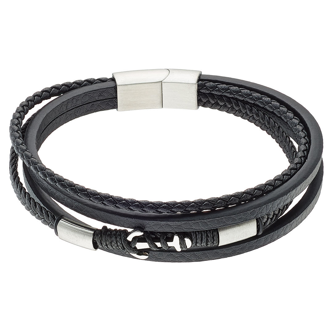 Βραχιόλι με μαύρο δέρμα καί άγκυρα, ατσάλι 316L