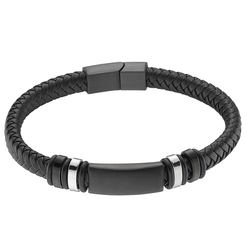 Βραχιόλι με μαύρο δέρμα καί μαύρη ταυτότητα, ατσάλι 316L
