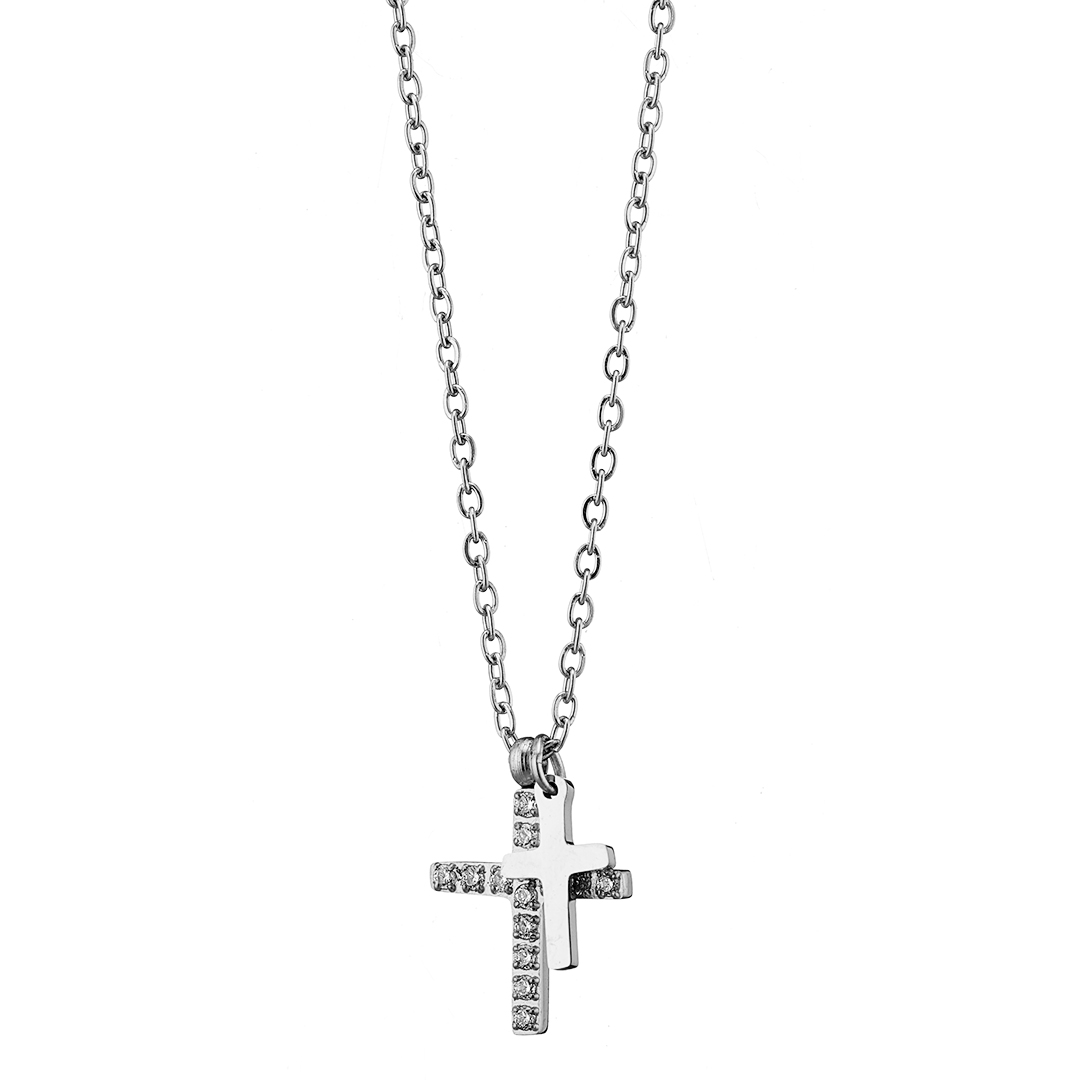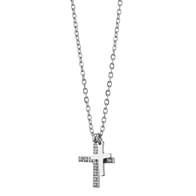 Κολιέ ασημί Σταυρός διπλός με ζιργκον ατσάλι 316L