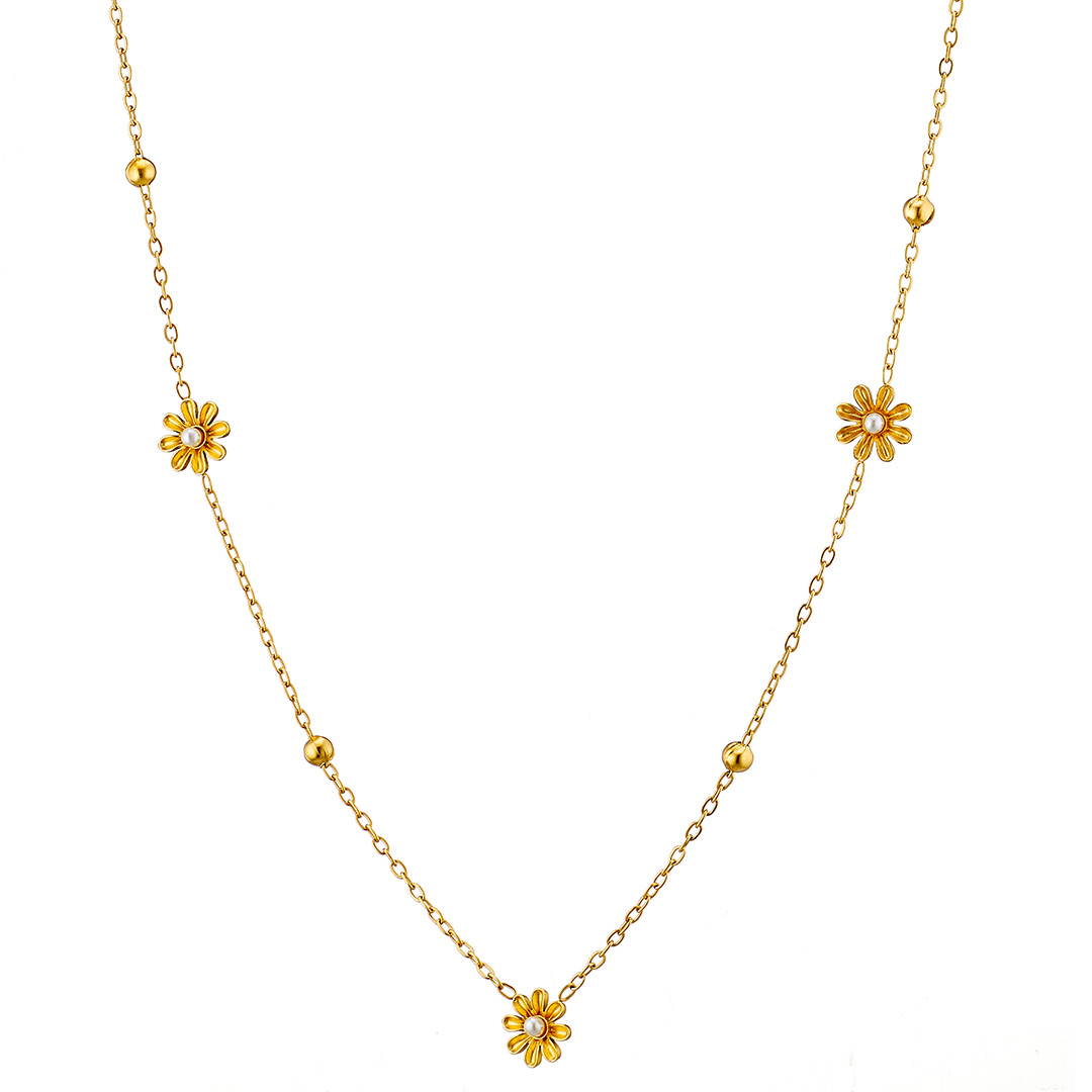 Κολιέ γυναικείο, επιχρυσωμένη αλυσίδα με στοιχεία λουλούδια μαργαριτάρι , ατσάλι 316L