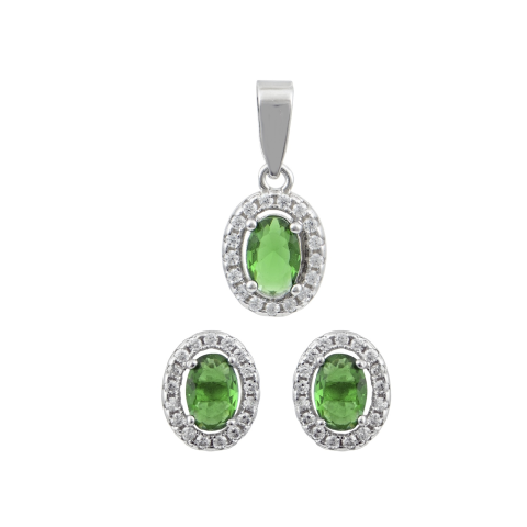 Κόσμημα set, πουάρ πράσινες πέτρες, ζιργκόν λευκά στην περιφέρεια, επιπλατινωμένα ασήμι 925